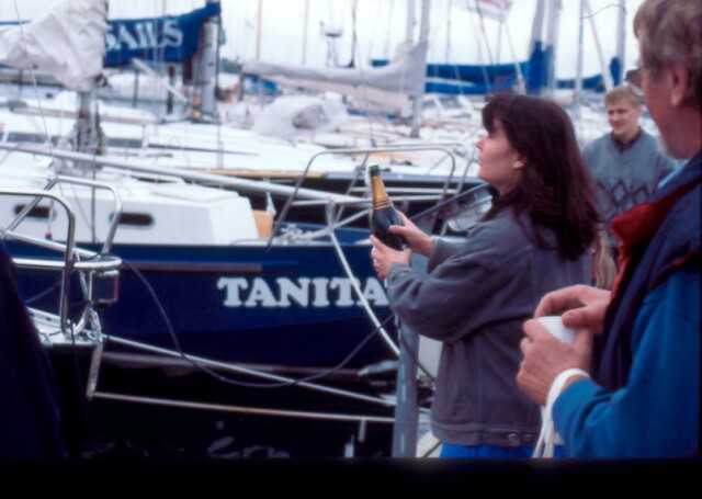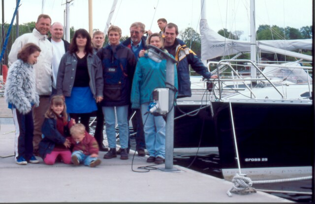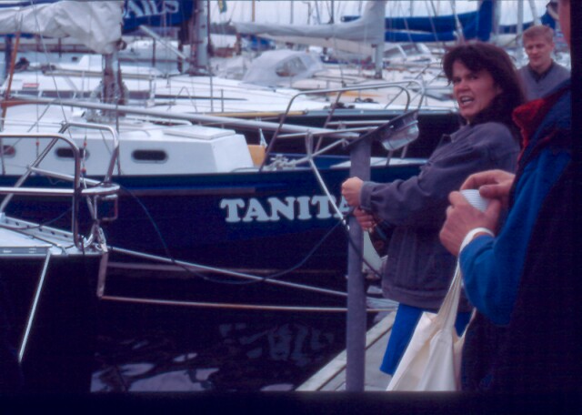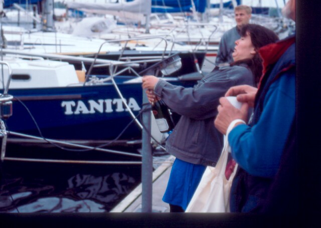 Bootstaufe.Die ganze Belegschaft ist erschienen. Bootsbauerin Tanja übernimmt den eigentlichen Taufakt, nachdem sich ihr Töchterchen im letzten Moment dann doch geniert hat bei so viel Leuten. Marty, der Werftleiter hält eine kurze Ansprache und überreicht mir als Taufgeschenk eine Flaggenparade und einen Blister. Ich bin richtig gerührt. Anschließend Grillfest bei LEE-Sails. Wegen der kalten Westfront, die immer noch das Wetter prägt, grillen wir draußen auf der Treppe (das weiße bundesdeutsche Einheitspartyzelt hat es uns schon mittags weggeblasen) und essen und trinken im Segellager. Wie immer allseits großer Appetit und großer Durst. Nachdem alles Fleisch und alle Würste verputzt sind, zaubert Sascha aus dem Eispanzer des Bürokühlschranks zwei uralte Flaschen "LINIE-Aquavit". Das geht runter wie Öl. Leider muß ich (wie immer, wenn ich mit den "Jungs" trinke) schon zwei Stunden vor dem eigentlichen Ende der Feier kapitulieren.