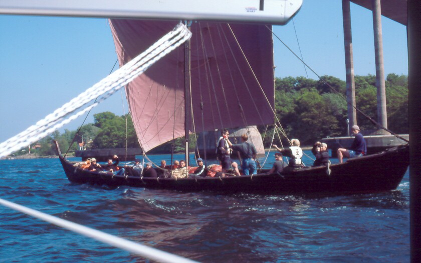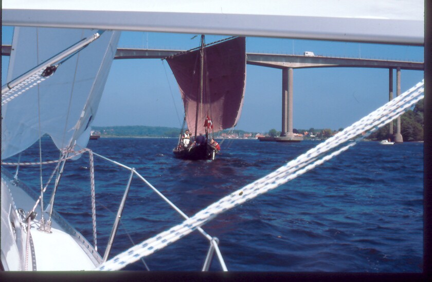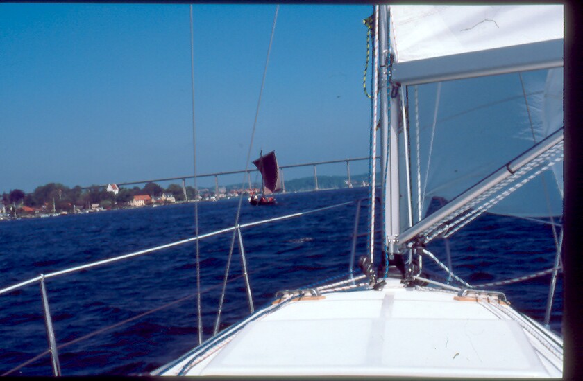 Dann, in der Einfahrt zum Svendborg-Sund, Wikingerschiff gesichtet. Lang, spitz, braunes Lateinersegel wird hochgezogen und entrollt, biertrinkende Schulklasse an Bord. Ich umfahre es mit einer Übungswende, denke, ich kann das auf dem Weiterweg mehrfach wiederholen, um mich am Anblick zu erfreuen, aber weit gefehlt. Der Museumskahn ist, einmal in Fahrt, nicht einzuholen, hängt mich sogar ab! Cruiser-Racer! Gibts offenbar seit tausend Jahren. Länge läuft.
