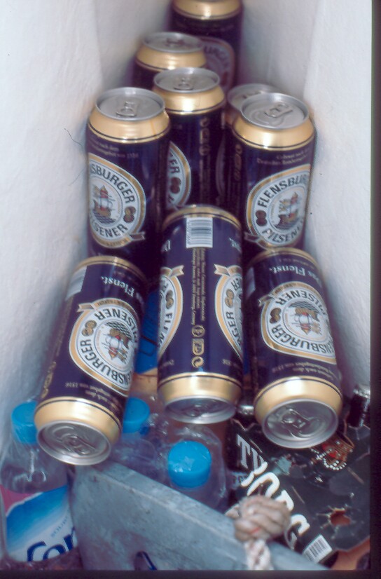 P.S.: Paranoia: Heute morgen nach dem Frühstück Spülwasserkanister über Bord geleert. Zufällig zu Boot am Steg gegenüber geschaut. Dänen erlickt, der in meine Richtung heftig die Faust schüttelt und, als wär es nicht genug, noch den international anerkannten Stinkefinger zeigt. Meine erste Reaktion: Ich fühle mich zu Unrecht kritisiert. Versuche es auf die Entfernung mit einer Geste, die sagen soll: Komm, das ist doch wirklich nicht so schlimm. Ist doch nur ein bißchen Kaffeespülwasser, wirklich nichts im Vergleich mit dem, was die Ostsee sonst tagtäglich erdulden muß.