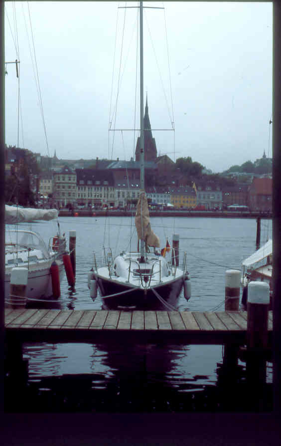 Ganz am Schluß entdecke ich weit voraus ein Folkeboot. Leider reicht die Reststrecke nicht, um ihm den Garaus zu machen, habe zwar ein Rennkrokodil, aber immer noch ein Segelboot. Glücklich erschöpft und im ersten Regen nach 10 Tagen "Probefahrt" in Farensodde in der Flensburger Förde eingelaufen, nur mäßig ungeschickter Anleger (immerhin keine Stegberührung), klar Schiff, Markus kommt, um sein Gepäck zu holen. Tee und Klön unter Deck. Schön, wieder zu ratschen, wenngleich die Zeit allein durchaus auch ihren Reiz hatte. Noch zusammen in Jessens Fischperle, große Seezunge für zwei Personen, dazu der Panoramablick auf Flensburgs Waterfront.