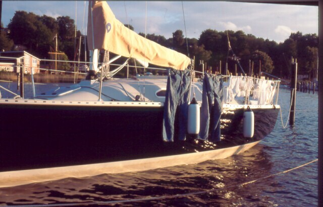Den ganzen Tag am Wasser verbracht: Am Steg, im Hafen, die vorletzten und letzten Arbeiten "unterstützend begleiten". Als da wären Moosgummi in Backskisten- und Ankerkastendeckel, Umfassung Teak im Cockpit mit schwarzem Fugenkleber, Toplaterne setzen, Windex nachmontieren, Rigg nachspannen usw. Nach getaner Arbeit (jetzt fehlt nur noch die Klemme für das Spifall sowie Schönheitssachen, die im Winter gemacht werden sollen) wird wieder mal gefeiert: Reiner Franz, Marty Müller und meinerseits gehen "etwas essen", bei "Rene". Echt irre: Rene führt Traditionslokal am Fördeufer. Ist ein eigentlich fescher Kerl mit gewisser verkommen-dekadenter Note. Bin ganz überrascht, daß er von "seiner Frau" erzählt, so sehr hätten Kleidung (schwarze Nappajeans) und Ausdruck zum Schwulsein gepaßt. Marty steckt mir nachher, Rene sei eigentlich "bi, und zwar bekennend", auch recht.