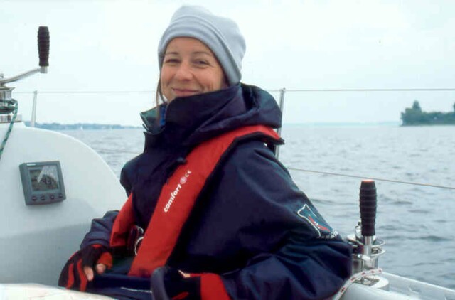 Am Pfingstsonntag: West 4-6, Schauerböen. Probetörn in der Förde. Ilona lernt schnell an der Pinne. Schon bald bin ich frei für Vorschiffsarbeit usw.. Rein in die Stadt, mit Halbwind wieder raus bis Glücksburg. Dort zunehmender Wind: Erst Reff 1, dann 2, jetzt wäre die projektierte Genua 4 gut, haben wir aber nicht. Zur Übung die Sturmfock angeschlagen. Wie schon einmal mit Markus: Entspanntes Cruisen gegenan auch bei 6 Beaufort. Ich erzähle und doziere und werde schon mal hart im (Kommando-)Ton. Ilona bleibt kooperativ und lernwillig (ich weiß: 5 Mark in die Machokasse). Schon heute bin ich überzeugt. Sie ist die Frau, mit der ich auch um die Welt segeln könnte.
