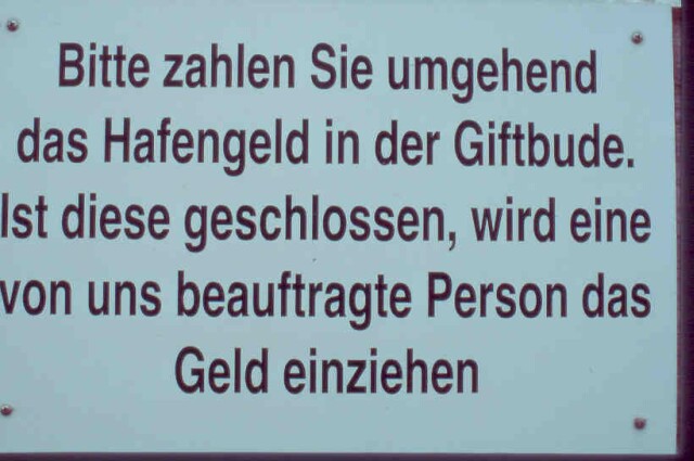 4, 5 Boote im großen, wenig geschützten Hafen ("bei Ooostwind liegt man hier recht unruhig", sagt der "Hafenlotse"). Die Plätze sind jeweils so groß, daß wir nur mit indischen Seiltricks uns zwischen den Dalben einhängen können. Aber die Action lohnt sich.