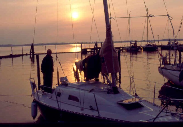 Ich denke mir: Daß es sowas noch gibt! Das Heck nach Westen, der untergehenden, im Dunst roten Sonne entgegen. Stille (der Hafen wird vom Festland durch ein Vogelschutzgebiet abgetrennt, keine Autos!), nur unterbrochen vom unanständigen Geschrei der Möwen und ab und zu einem Kutter oder einer Yacht, die schleiaufwärts streben in zivilisiertere Gefilde.