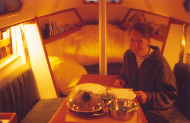 Ilona ist über Bord gegangen! Um Mitternacht, man sieht die Hand nicht vor Augen. Ich sitz beim letzten Glas Rouge am Kajüttisch und mache Notizen. Sie sagt, sie wolle noch "außenbords gehen" (mangels Bordtoilette).