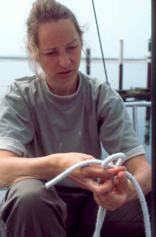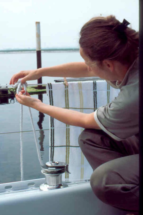 Auf einmal ein Riesenplatsch und Gepruste. Dann halblautes Rufen meines Namens. Ilona, immer noch relativ neu an Bord hat sich, schön in der Hocke, an der Badeleiter festgehalten, nicht wissend, daß diese sogenannte Badeleiter nur auf Abruf und für Rettungsfälle in einer vergleichsweise losen Plastikhalterung steckt. Na immerhin hatte das Opfer das Rettungsgerät schon in der Hand. Jetzt hängt das Schiff voller Wäsche.